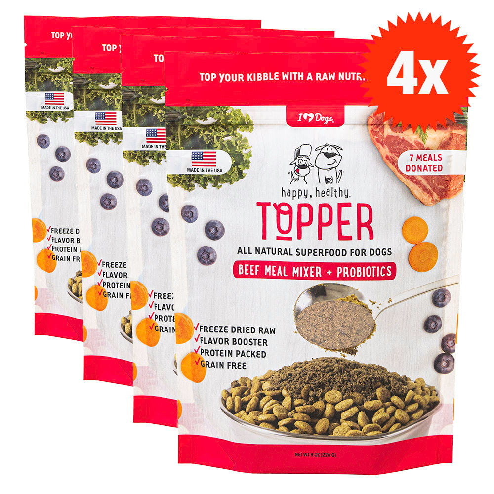 Our Happy, Healthy Topper provides everything good your dog would eat by nature. It’s a healthful boost to your pup’s daily meals, so you don’t have to worry about the amount of nutrition in your pup’s dinner. Made with fresh, human-grade food – it’s a super tasty, wholesome way to increase the nutrition in your pup’s diet, without switching the dog food!