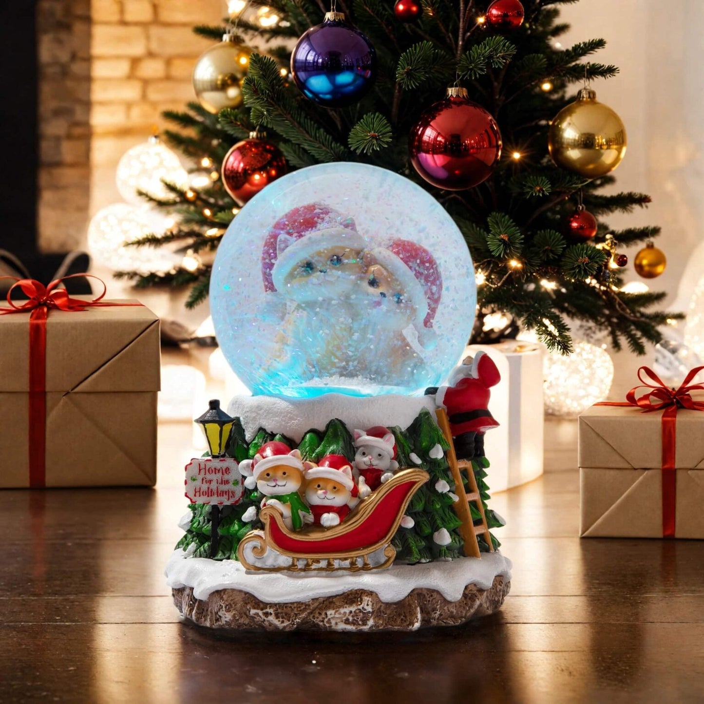 Home For The Holidays Christmas Musical, Water Glittering Cat Snow Globe – Plays 7 Traditional Holiday Songs Including Jingle Bells & Color Changing Lights -Faire