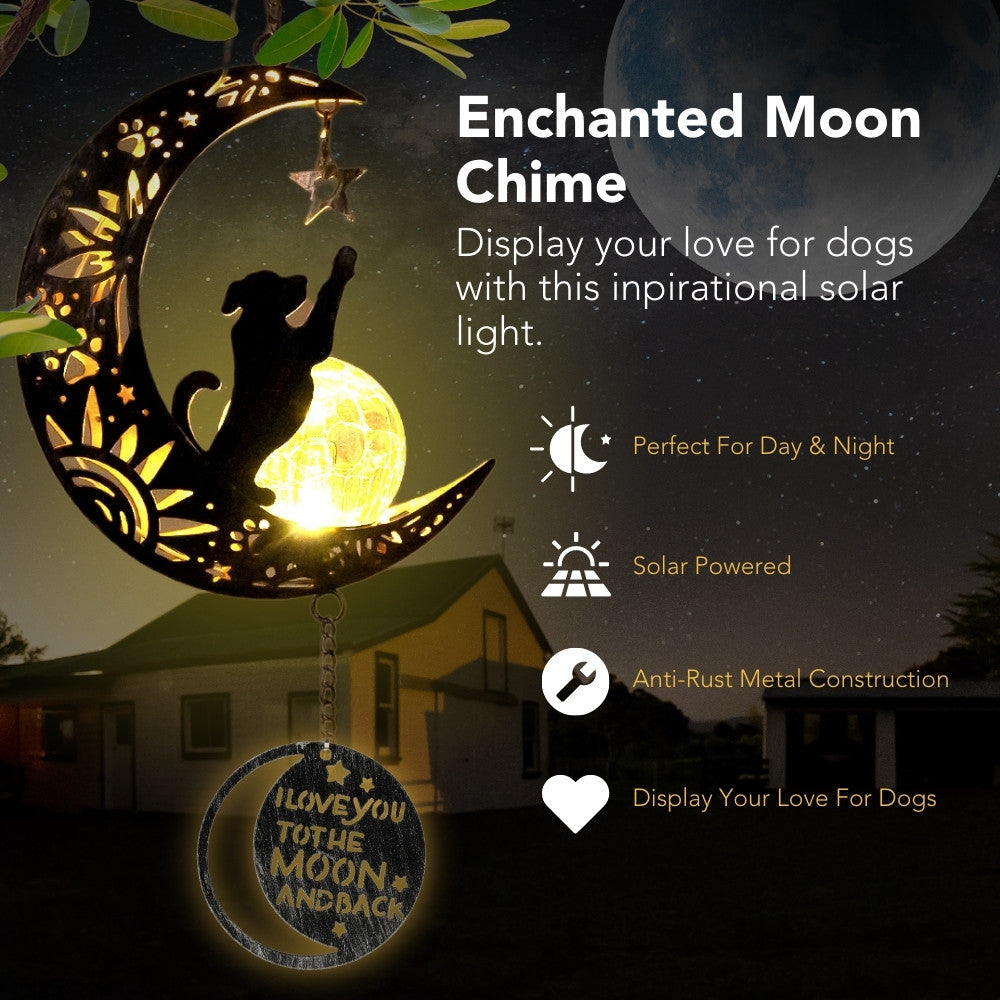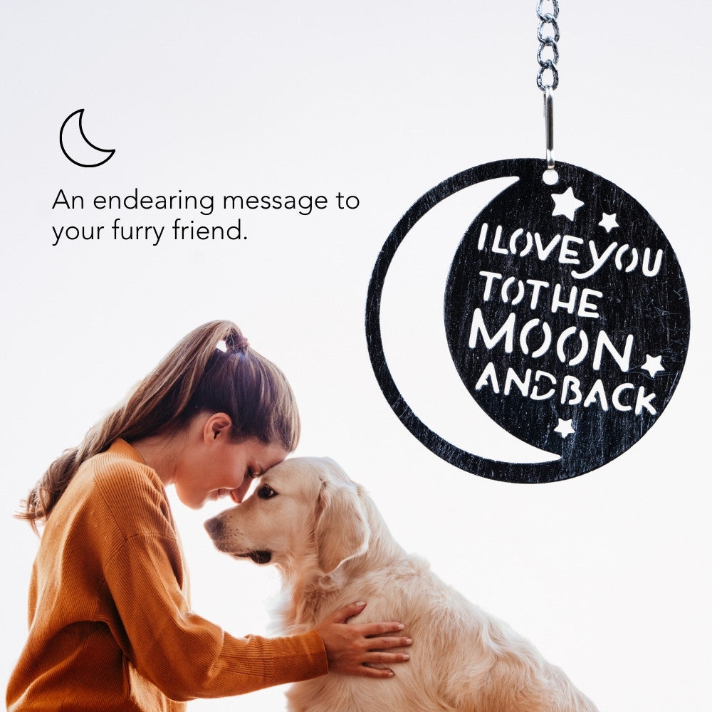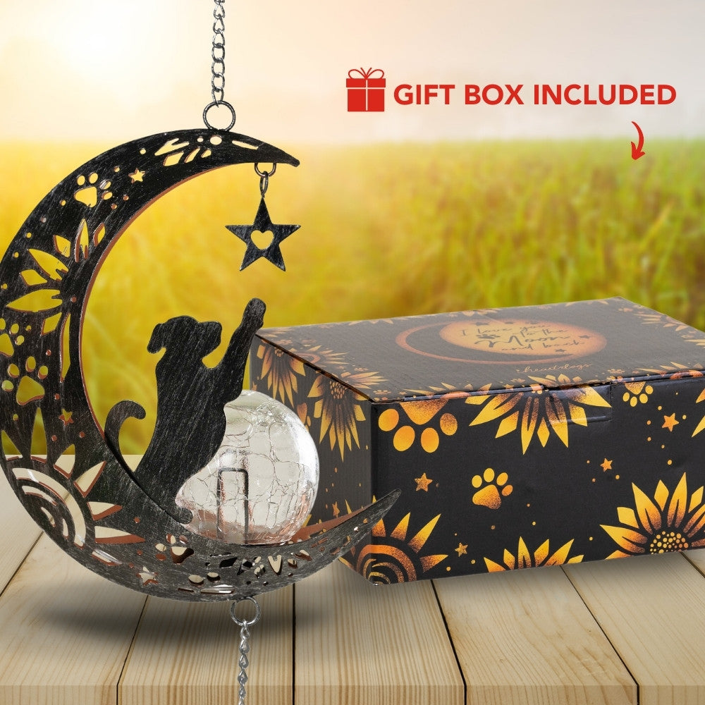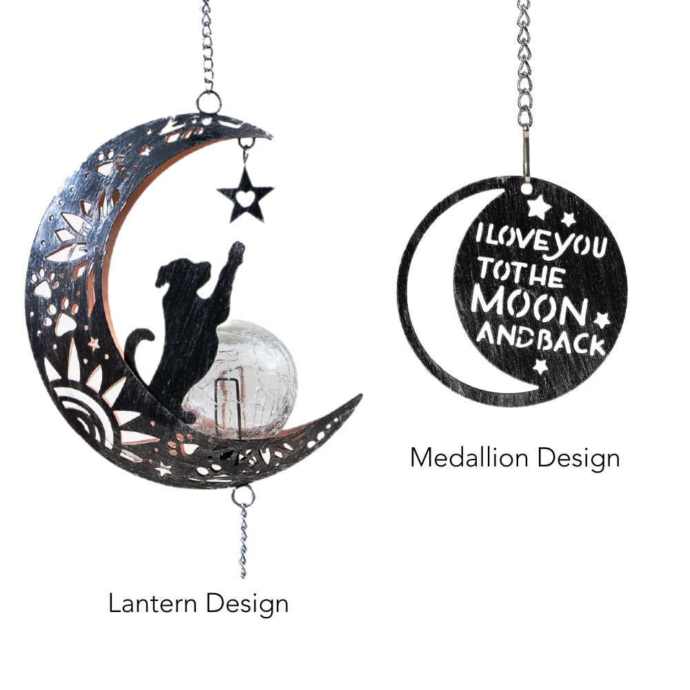 - Darling Design Shows Your Devotion - Because you love your dog to the moon and back, you’ll love this pup standing on a crescent moon with cut-out flowers, paw prints, and stars. And you’ll love how the dog reaches to catch a dangling star while the whole scene is lit by a glowing orb. The swinging pendant compliments the design with its words of love.