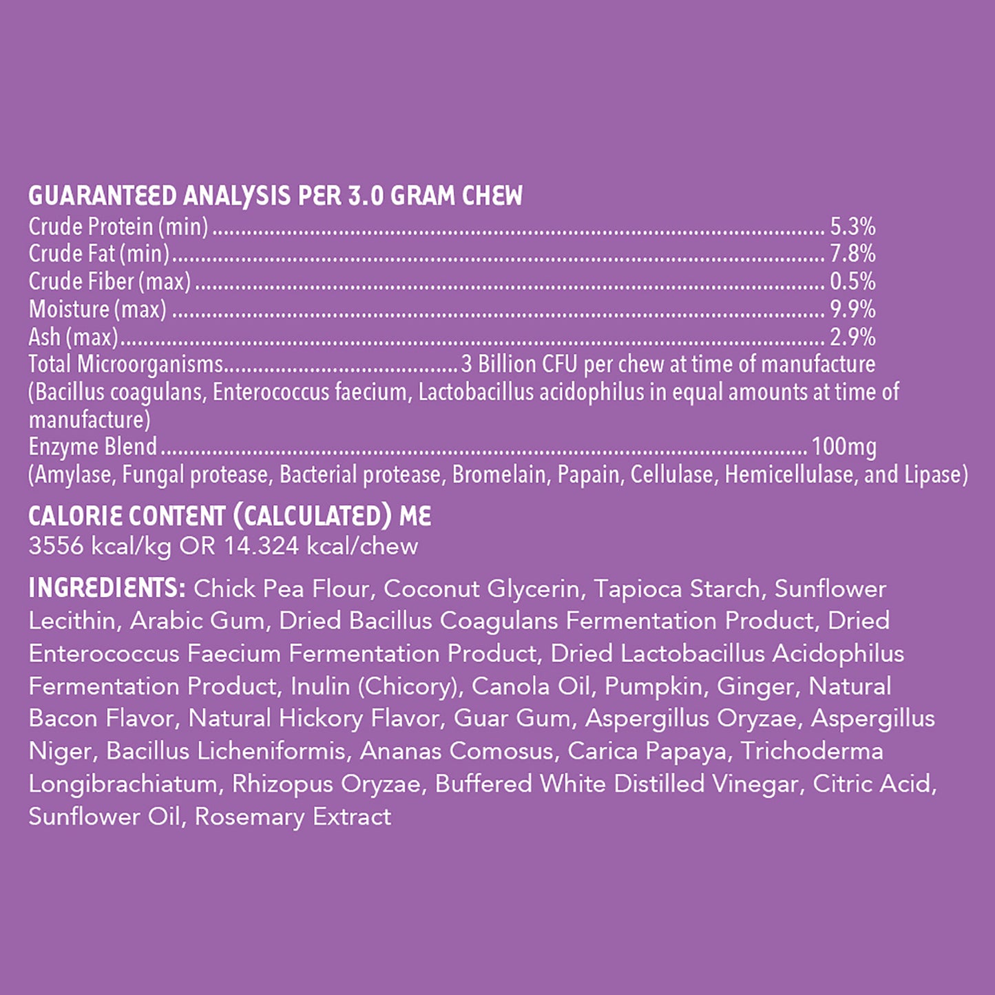 - Probiotics, prebiotics and digestive enzymes, combined in one delicious chew