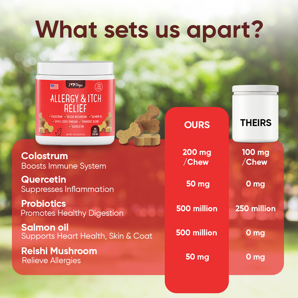 What we see with this allergy and itch chew is that these key ingredients (colostrum, reishi mushrooms, & quercetin) in combination are the most powerful, natural way to effectively reduce symptoms of allergies. We give it two thumbs way up because these ingredients are ALL-NATURAL and go to work quickly in your dog.