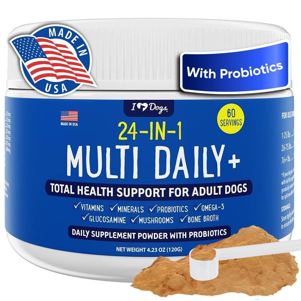 iHeartDogs 24-in-1 Adult Multivitamin Daily+ Total Health Support Powder with Probiotics, Omega-3, Glucosamine, Mushrooms & Bone Broth- 60 Servings